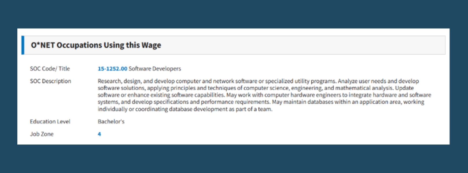 Directly beneath the prevailing wage chart, the hyperlink for SOC 15‑1252.00 opens the O*NET occupation profile. This profile provides the foundational information DOL uses to determine the “normal” requirements for the role.