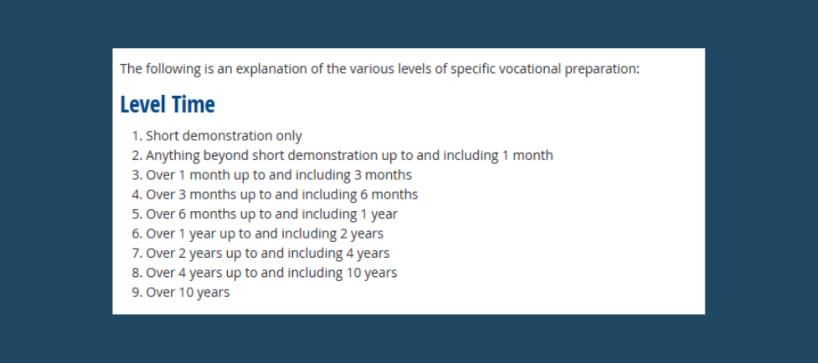 The SVP range is especially important because DOL uses it to determine what level of experience is considered “normal” for the occupation.