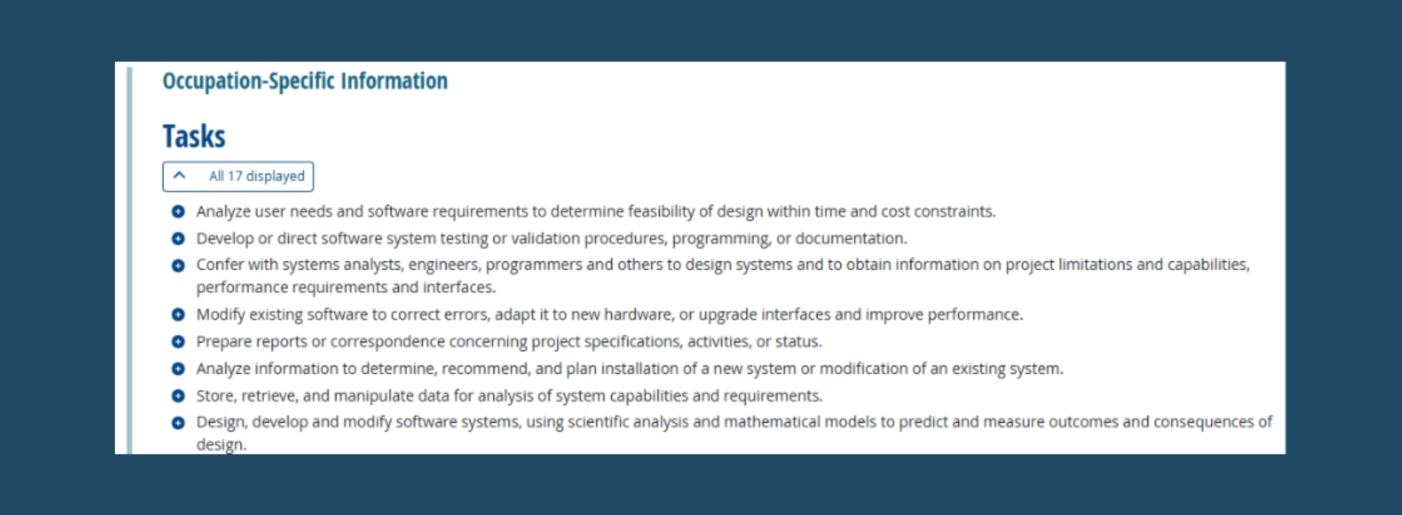 O*NET provides additional detail about the role, including common job titles and the specific tasks associated with the occupation.