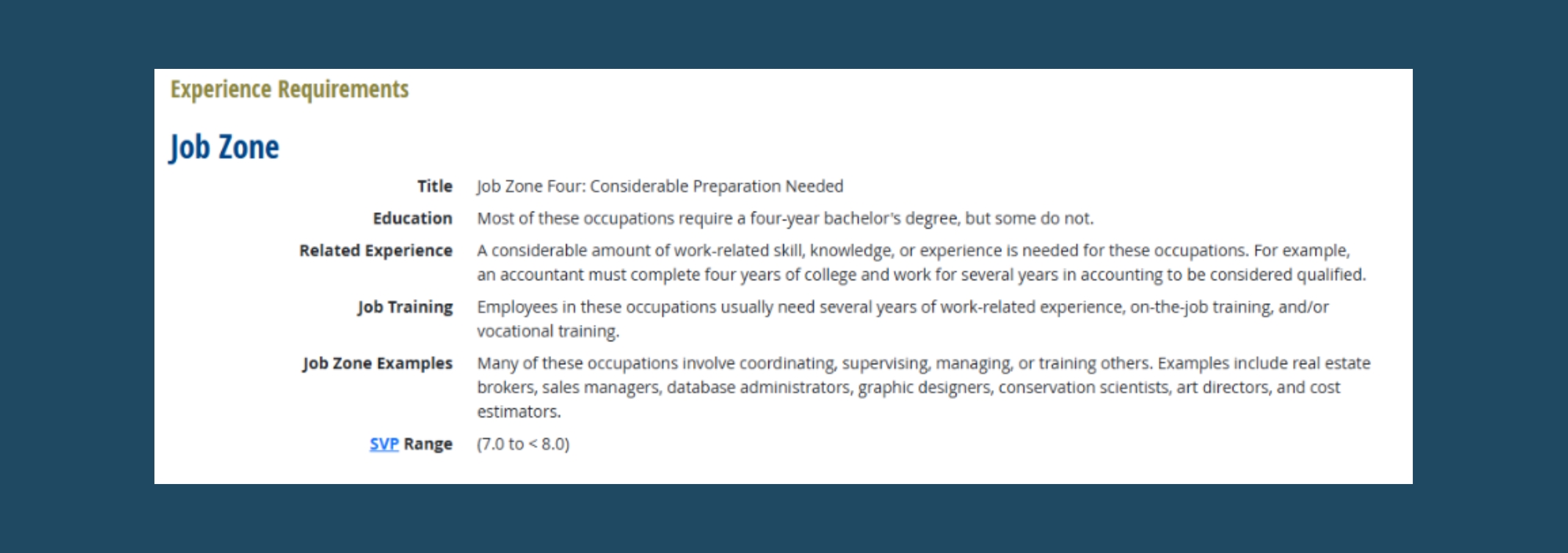 O*NET also provides the Job Zone and SVP range for the occupation.